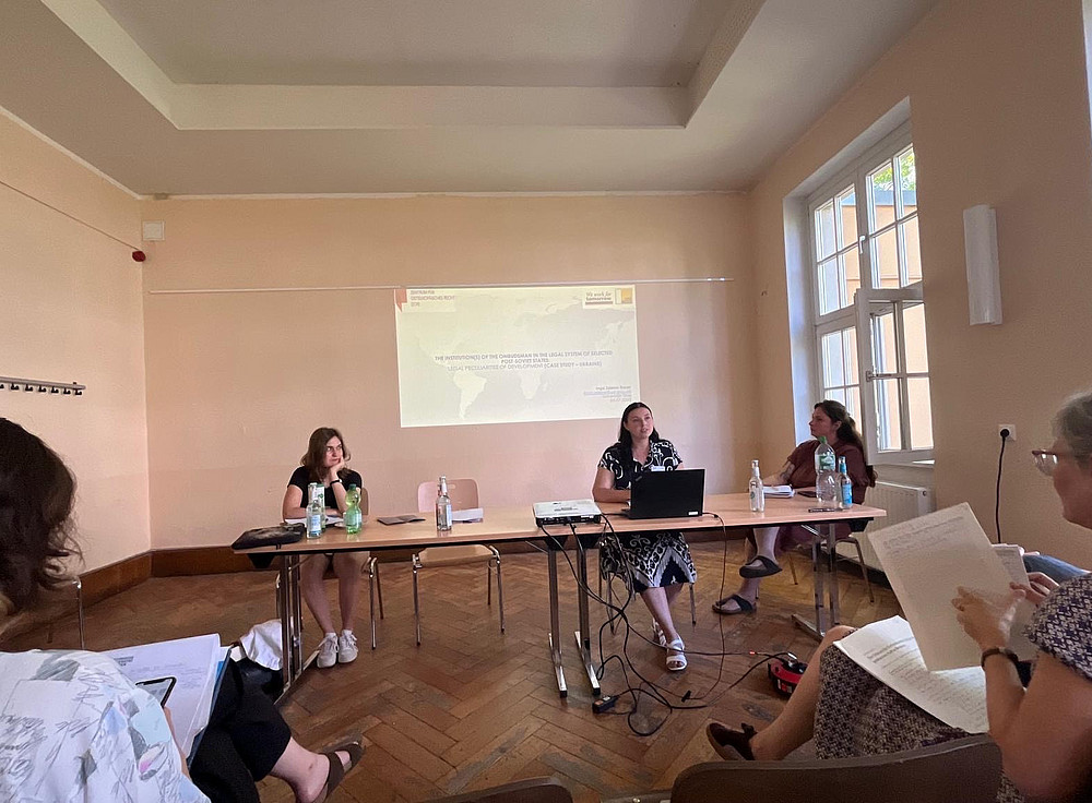 Im Rahmen des 12. Panels „Staatliche Institutionen und gesellschaftliche Aushandlungsprozesse“ präsentierte Inga Zelena-Bauer, LL.M., MA vom Zentrum für osteuropäisches Recht als Referentin ihren Beitrag zum Thema “The Institution(s) of the Ombudsman in the Legal System of Selected Post-Soviet States: Legal Peculiarities of Development and Implementation (Case Study – Ukraine)”. Nach dem Vortragen folgte ein fachlicher Austausch mit ausgewiesenen Fach-Vertreter:innen zu jedem von drei Hauptbeiträgen des Panels und schließlich eine thematische Diskussion mit der Fragenbeantwortung.
